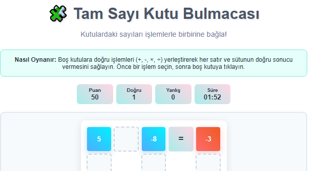 Bu Tam Sayı Kutu Bulmacası, matematiksel düşünme ve problem çözme becerilerinizi geliştiren eğlenceli bir zeka oyunudur!